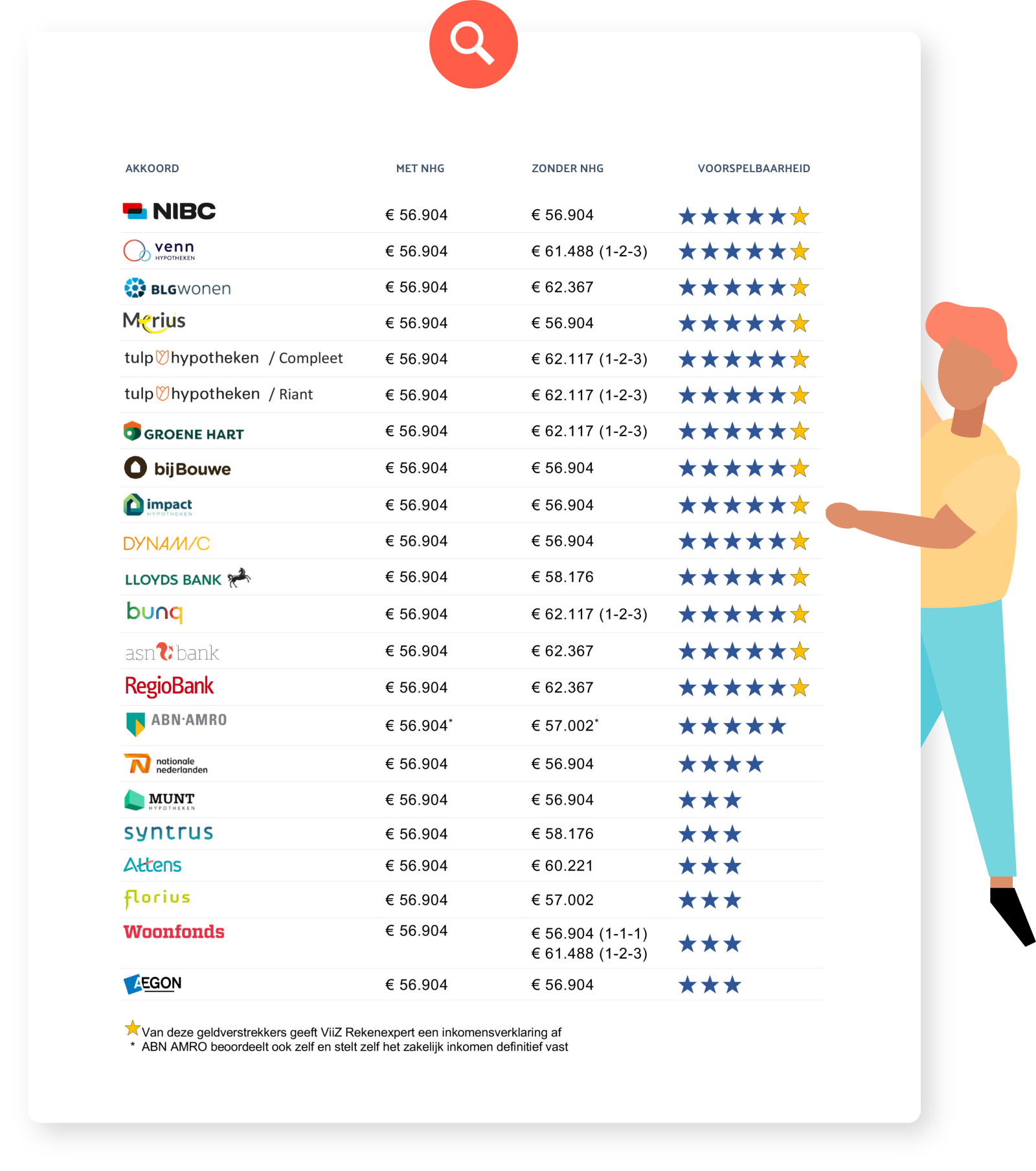 Voor de geldverstrekkers met 5 sterren én een gouden ster ★★★★★ is de voorspelbaarheid het grootste en voor deze aanbieders kunnen wij als rekenexpert aanvullend een inkomensverklaring zonder NHG afgeven.